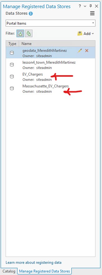 I started off by gathering data from various states’ Open GIS Data Portals online, available to the public. Both Michigan and Massachusetts have a robust and thorough offering of GIS data on their portals, and make it easy for users to download these in workable files (.shp, .kml, .csv, gdb.zip, etc.). The Massachusetts Department of Transportation has a very recently updated dataset of the state’s electric vehicle charging stations, and the Massachusetts Bureau of Geographic Information (MassGIS) has an updated dataset of the state’s recreational spaces and the trail networks, all of which I used for the project. Michigan Open GIS Data is always a great resource, and is where I found all four datasets that I used on the state’s electric vehicle chargers, State Park boundaries, campgrounds, and trails. I downloaded all of these datasets and imported them into ArcGIS Pro. After data prep and symbology in ArcGIS Pro, I used the instructions from Lesson 3 to move all of the data into an ArcSDE geodatabase in SQL Server Express (Figure 1) so that I could allow the user to edit the data – if new electric vehicle stations are built over time, my web map/app could still stay updated and relevant.