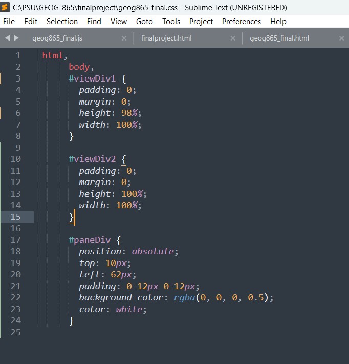 Once my data was on the server, I began working with Javascript (Figure 3), HTML (Figure 4), and CSS (Figure 5) to create a customized, interactive web map using the data.