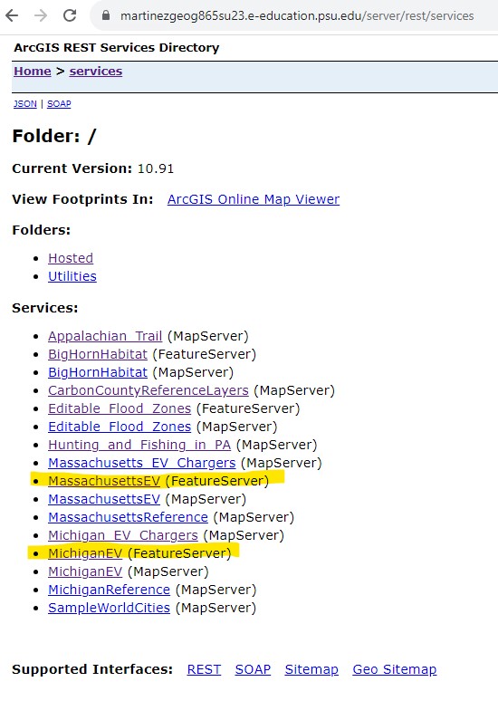 I separated my data out into reference layers (campgrounds, park boundaries, trails) and editable layers (EV chargers), and I was able to successfully serve my editable layers as FeatureServers on my ArcGIS REST Server (Figure 2), along with serving my reference layers as regular MapServers so they could be layers in my web map.