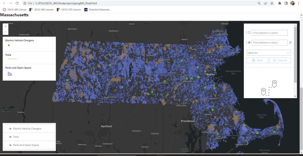 Using the ArcGIS API for Javascript, I was able to make a site that showed both maps (one of Michigan and one of Massachusetts), one on top of another, with helpful pop-ups enabled and widgets around them that allowed the user to interact with the data in ways that are relevant, including directions, layer list, legend, and zoom (Figure 6 and Figure 7).