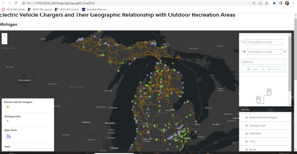 I wanted to be sure to include the directions widget to allow the user to pinpoint an outdoor recreation area and it’s nearest EV charger and be able to quickly see how far of a drive it would be between the two. I hadn’t worked with directionsWidget before, so it was fun experimenting with routeLayers for the first time. It took some time, but I got it to where I was content with the functionality of the web page. I also went ahead and used the same data from my server to create an Experience app in ArcGIS Online (using Experience Builder). I uploaded the data to my ArcGIS Online account using the add-by-url feature to grab them straight from the server. In Experience Builder, I set the two web maps side-by-side, surrounded by their corresponding widgets as described above (Figure 8).